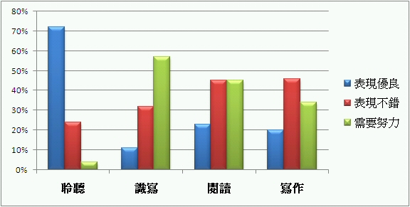 根據上列4圖可見聆聽能力表現最佳(通過比率高達九成六),閱讀能力次之(通過比率約六成八),寫作能力再次之(通過比率約六成六),而識寫能力的表現則是差強人意(通過比率僅4成三)。